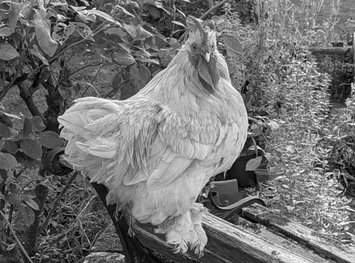 Sam is about a quarter the size of Albert, but he’s little and quick and fierce and Albert is a big slow lummox with very poor eyesight due to his magnificent topknot. Sam once scared him so badly he flew over the hedge into the field next door, which was a joy to deal with.