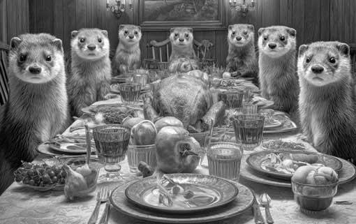 This image, I mean. It’s awkward. I asked the robot for a Thanksgiving dinner with all weasels this time and most of them were similar to the badgers one. Except this one, which has a real “you farted” vibe.