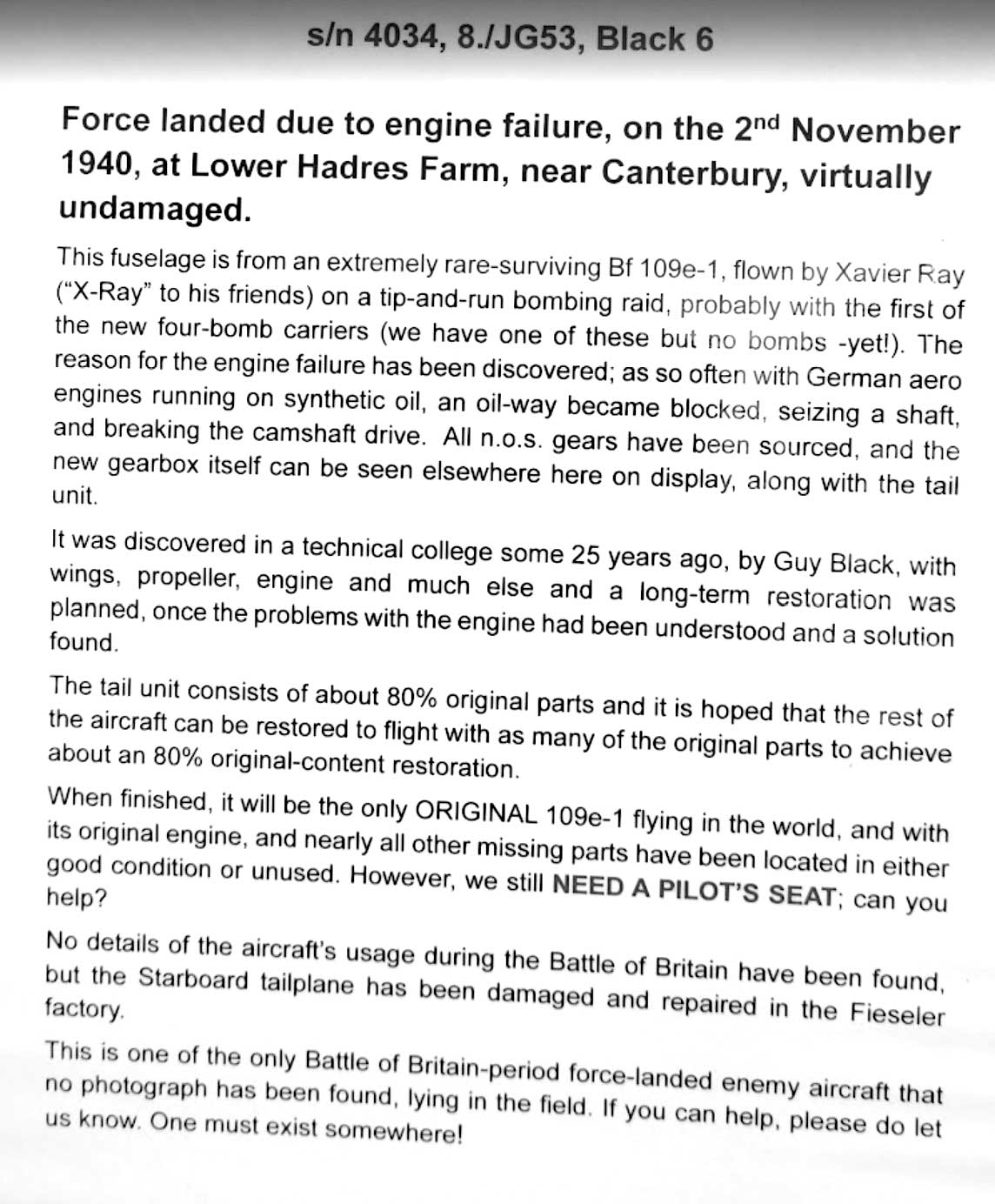 They are rebuilding a Messerschmitt. This very one, in fact. It came down in one piece near Canterbury in 1940. They had a display with many of the parts they’ve been able to salvage or machine and they hope the final airplane will be about 80% original.